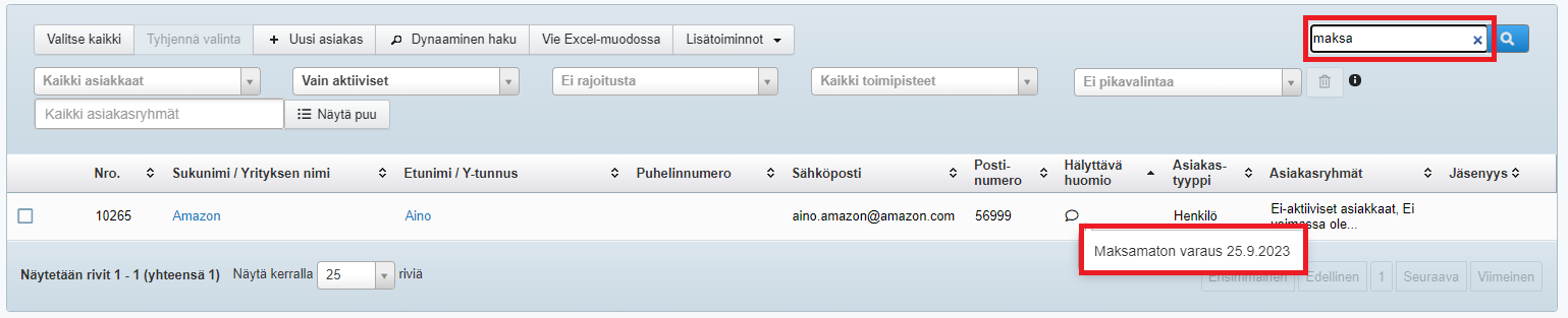 - Nyt Asiakkaat-ohjelman Hälyttävä huomio -kentässä näkyy tieto asiakkaan maksamattomasta varauksesta. Kun sovitte yrityksessä yhteisistä merkintätavoista, saat suodatettua esim. "maksamaton"-haulla näkyviin kaikki ne asiakkaat, joilla on maksamattomia varauksia:
