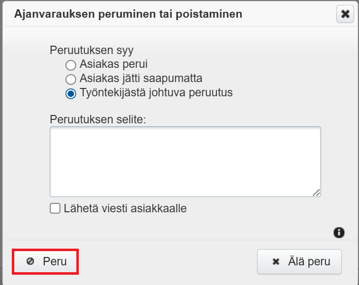 - Valitse lähetetäänkö asiakkaalle viesti peruutuksesta. Pääset muokkaamaan peruutusviestiä ennen lähetystä.