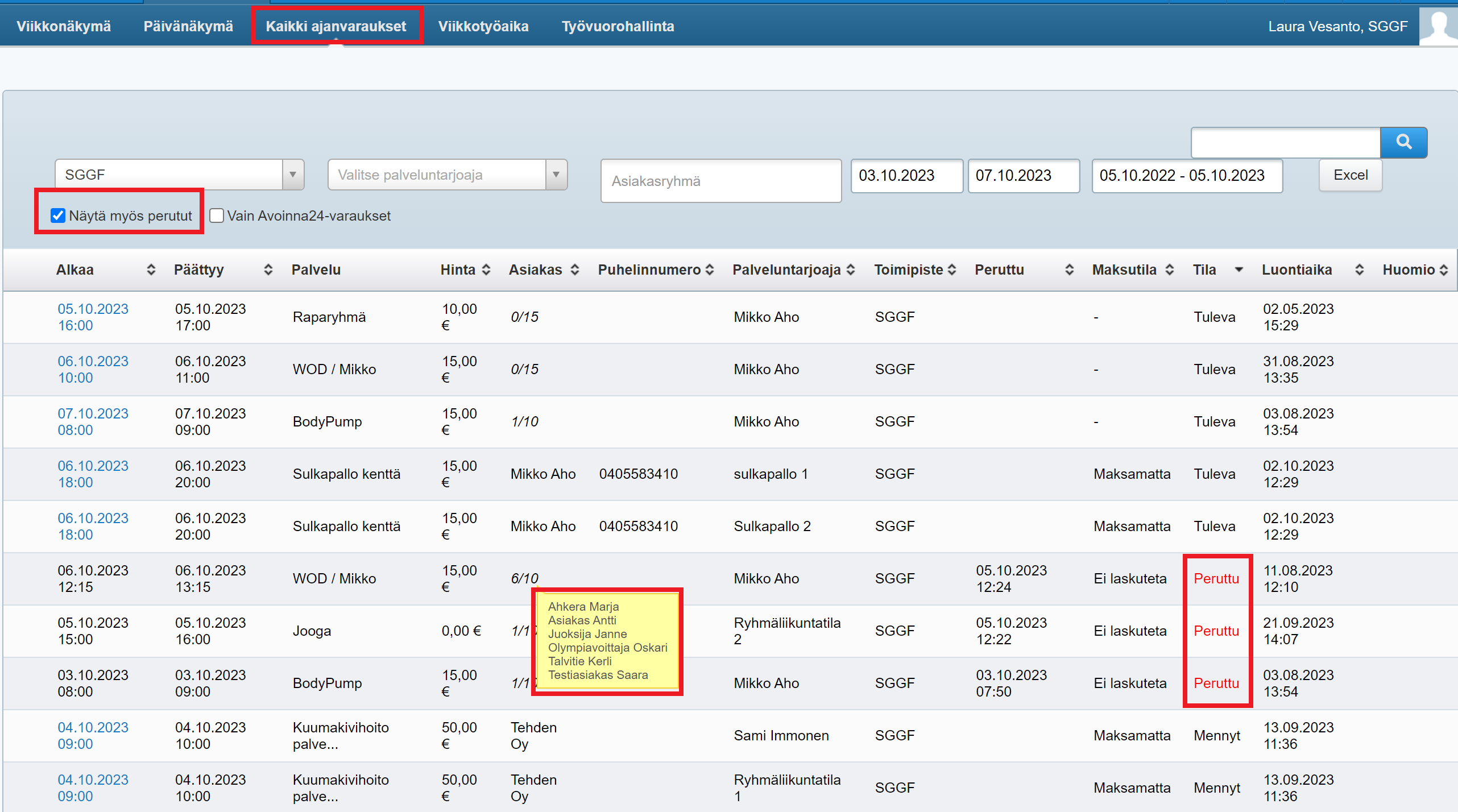 - Vie hiiri ryhmäajanvarauksen Asiakas-sarakkeen osallistujamäärän päälle, niin näet listan asiakkaista, jotka ko. ryhmäajanvaraukseen ovat ilmoittautuneet: