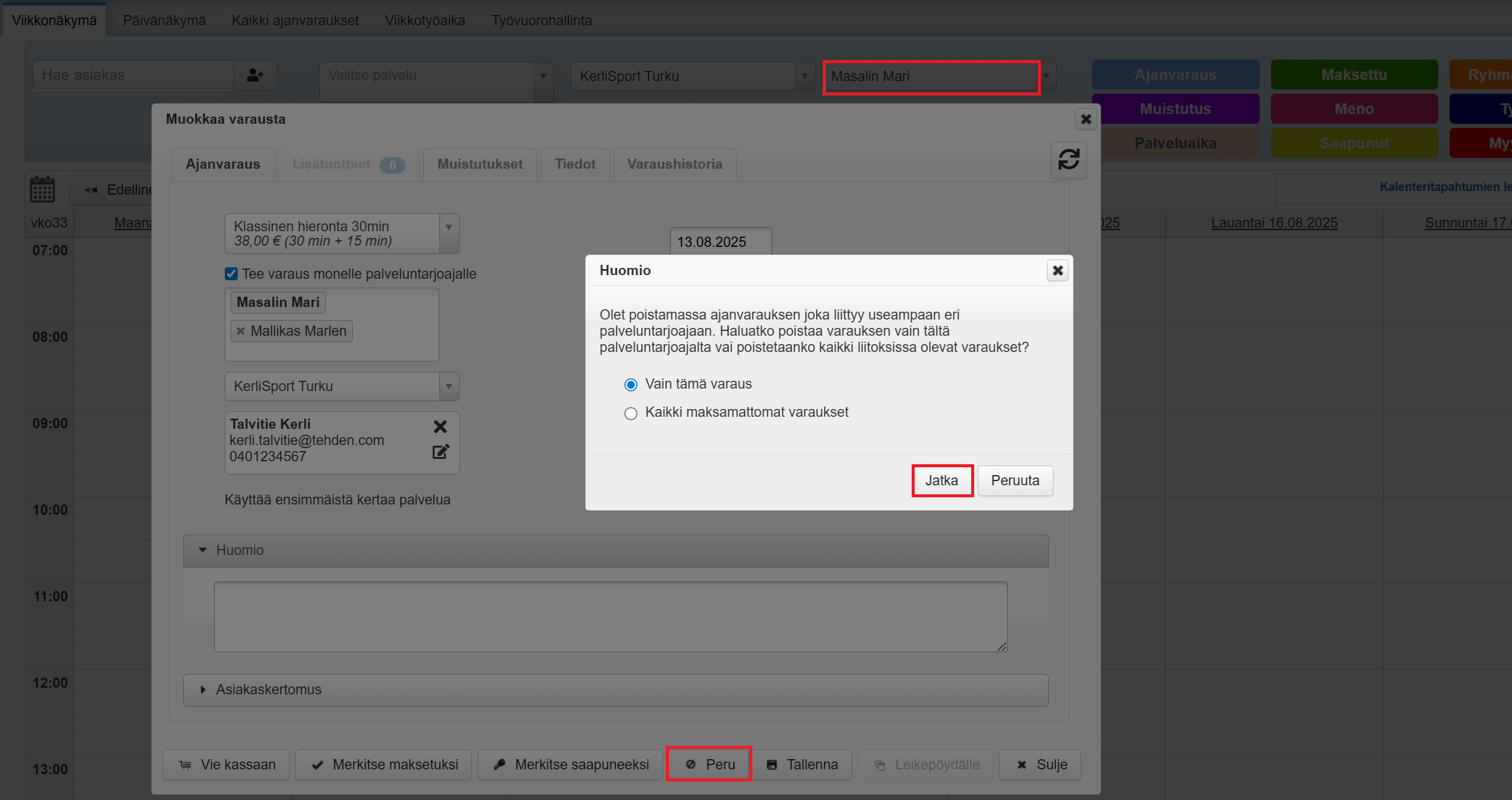- Avaa sitten oikea varaus ja napsauta Peru-painiketta. Tehden varmistaa, halutaanko varaus perua vain kyseisen palveluntarjoajan kalenterista vai kaikilta palveluntarjoajilta: