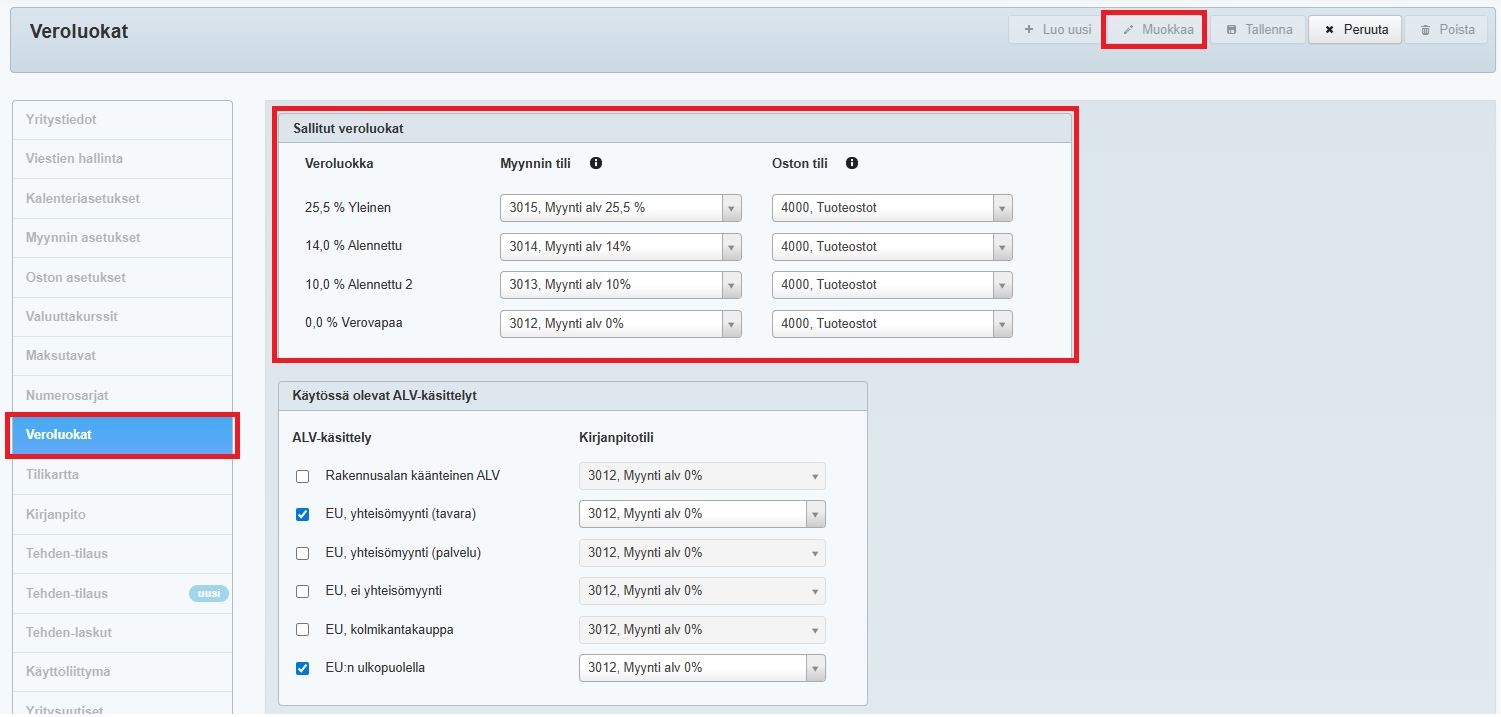 Veroluokat-välilehdellä hallitaan myös yrityksen käytössä olevia ALV-käsittelyjä sekä asiakastyyppikohtaisia myynnin tilejä.