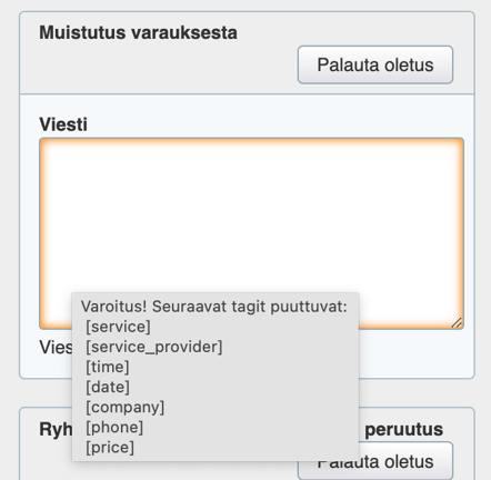 - Voit palauttaa oletusviestin Palauta oletus -painikkeella.