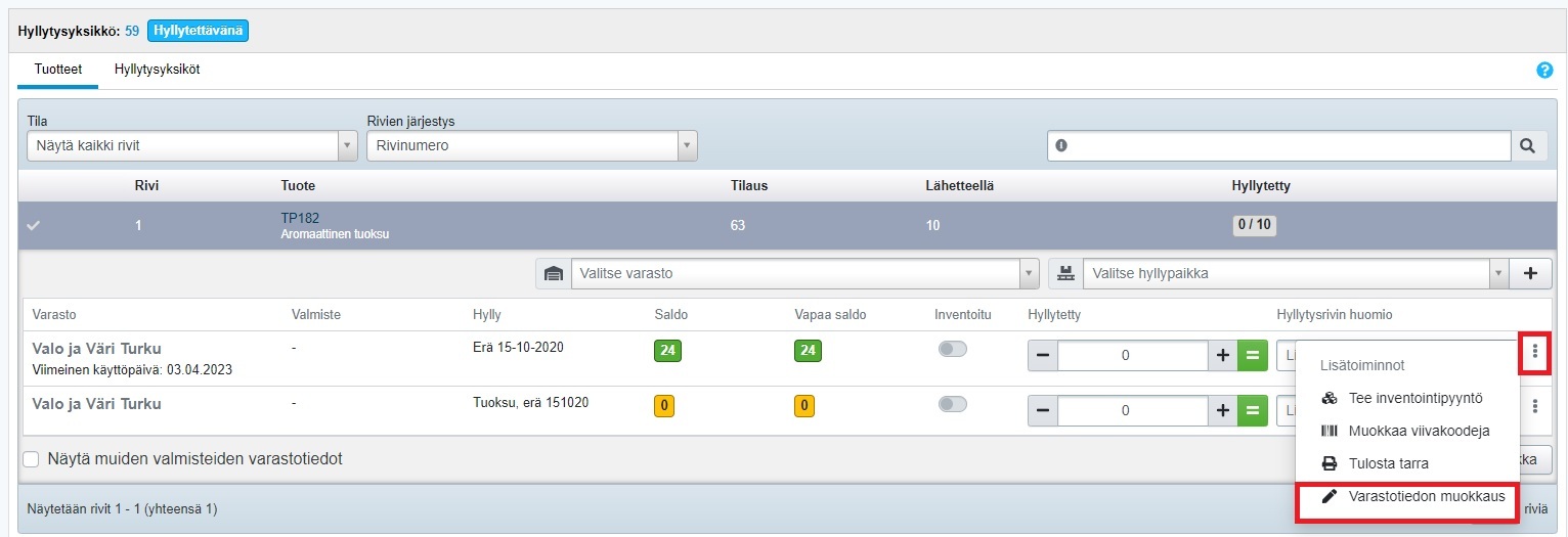 - Kun tilaamasi tuotteesi saapuvat ja otat ostotilauksen hyllytettäväksi, näet tuoterivin kohdallakolme pistettä. Niitä klikkaamalla pääset muokkaamaan varastotietoa: