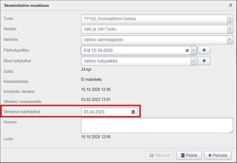 - Varastotiedon muokkaus -ikkunassa voit määritellä tuotteen viimeisen käyttöpäivän.