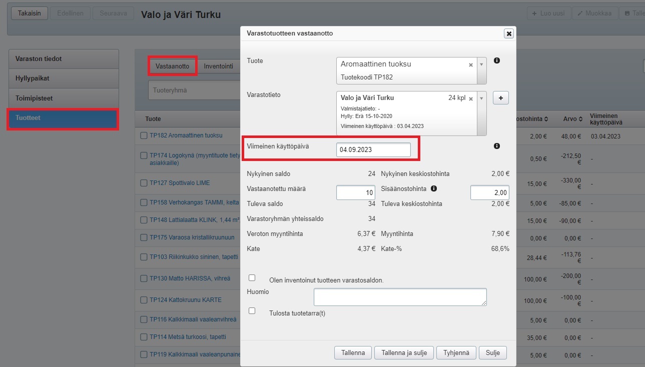 - Kun nyt tallennat vastaanoton, näet varastossa vastaanotettujen erien viimeiset käyttöpäivät: