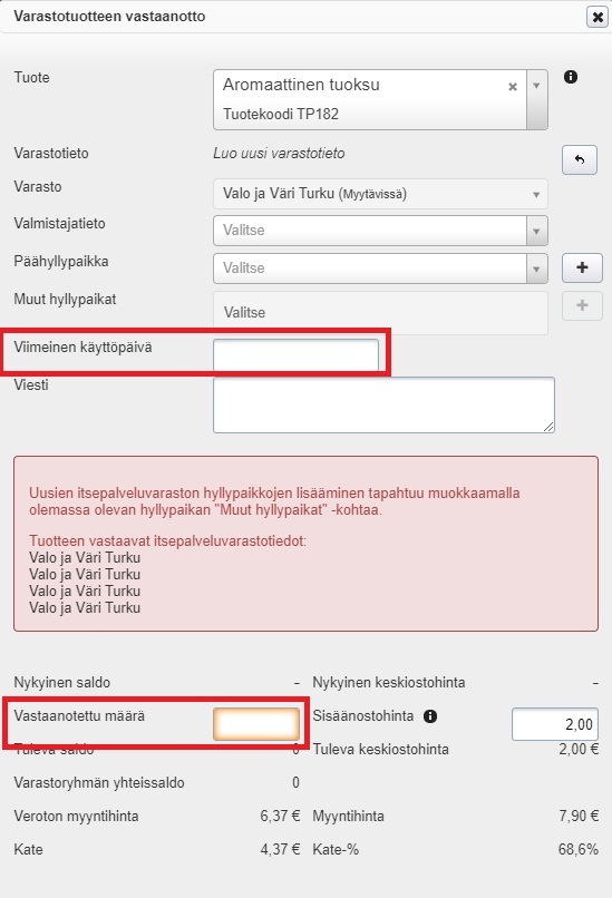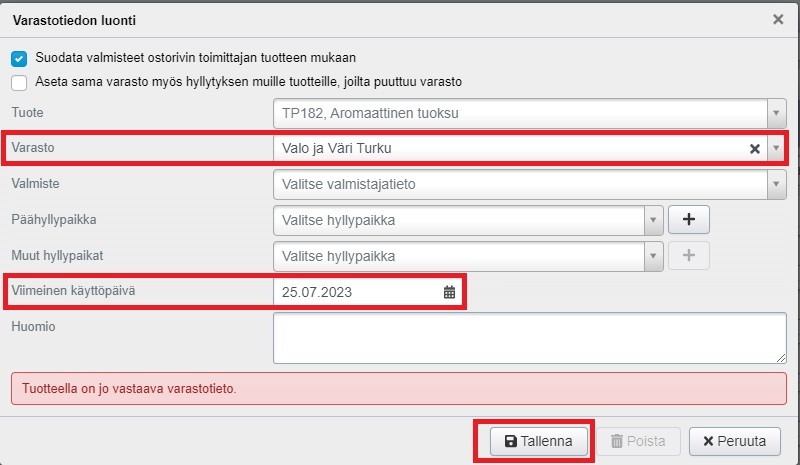 - Valitse pudotusvalikosta oikea varasto ja lisää viimeinen käyttöpäivä. Tehden ilmoittaa, että tuotteella on jo vastaava varastopaikka, mutta kun tallennat tiedon, tuotteelle luodaan varastopaikka oikealla viimeisellä käyttöpaikalla: