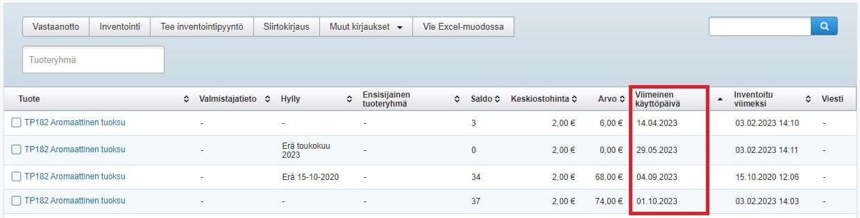 - Kun hyllytys on valmis, tuotteen käyttöpäivätieto löytyy varastosta, ja voit seurata erääntyviä tuotteita siellä.