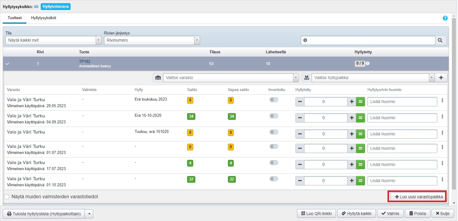 Viimeisen käyttöpäivän voi lisätä myös ostotilauksen hyllytyksen yhteydessä. Muista, että jos tuotetta on jo varastossa toisella viimeisellä käyttöpäivällä, hyllytyksen yhteydessä on luotava uusi varastopaikka.