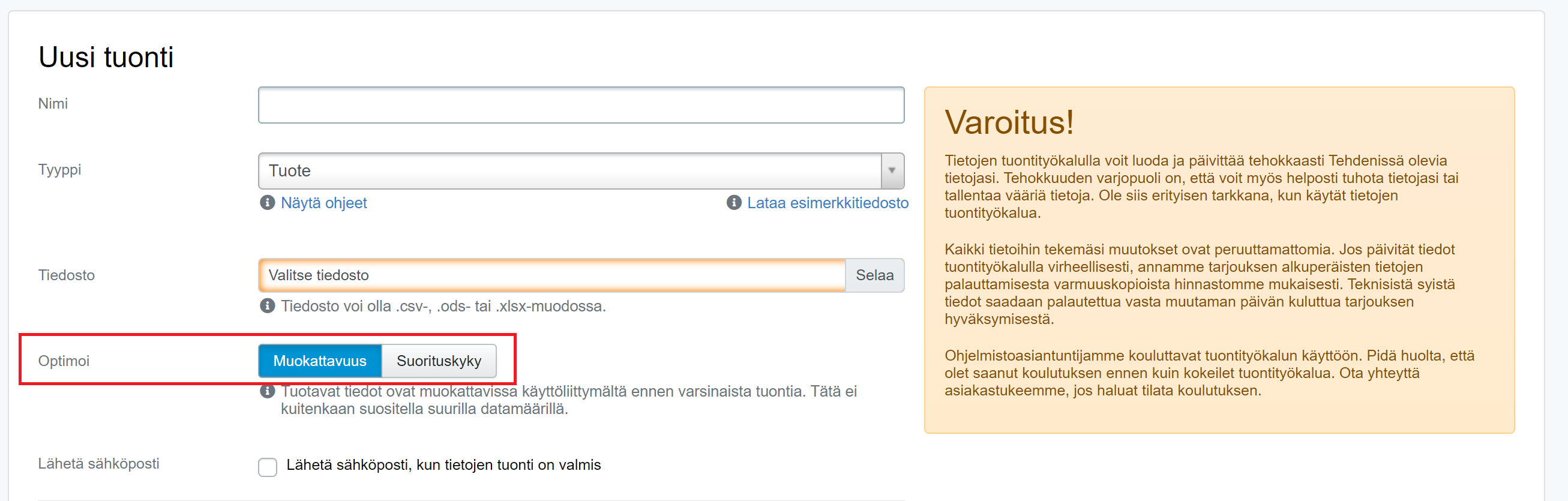 - Suorituskyvyn optimointi on tarkoitettu yrityksille, joiden tuote- ja asiakasmäärät ovat suuria ja päivityksiä tehdään suurissa erissä. Suosittelemme valitsemaan tämän vaihtoehdon, kun rekisterissä on vähintään 100 000 tuotetta tai asiakasta ja/tai näitä tietoja päivitetään suurina massoina. Suorituskyky-valinnalla tietoja ei voi enää tiedoston lataamisen jälkeen muokata tietotuontityökalulla. Huom! Suorituskyky-valinnalla voi tuoda jopa esim. 100 000 riviä kerrallaan, mutta tiedoston useampaan pienempään kokonaisuuteen jakaminen (esim. 25 000 riviä/tuonti) nopeuttaa tarkistuksien ja tuontien valmistumista.