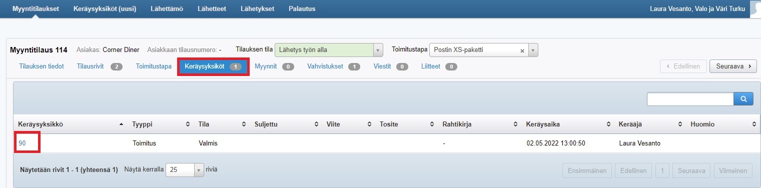 - Siirry Keräysyksiköt-ohjelmaan ja etsi virheellinen keräysyksikkö esim. asiakkaan nimellä tai tilauksen numerolla suodattaen. Löydät myyntitilauksen keräysyksikön myös myyntitilauksen kautta, Keräysyksiköt-välilehdeltä: