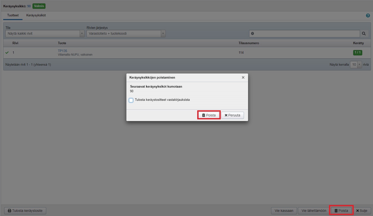 - Klikkaa keräysyksikön numeroa ja sitten Poista-painiketta alalaidasta. Tehden kysyy, halutaanko vastakirjauksista tulostaa keräystositteet. Valitse Poista: