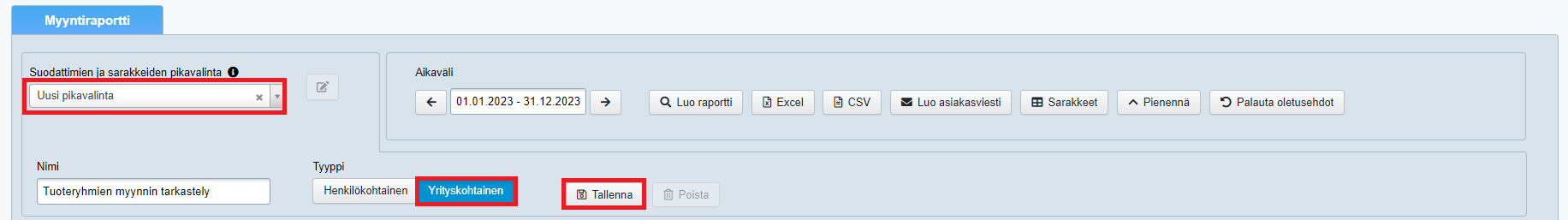Voit tallentaa tekemäsi raportin pikavalinnaksi itsellesi tai yrityksesi kaikkien raportointikäyttäjien käyttöön. Voit ajaa näppärästi saman raportin toistuvasti pikavalinnoista (esim. kuukausittain). Pikavalintaan tallentuu kaikki raporttiin valitsemasi suodattimet, ryhmittelyt, sarakevalinnat ja muut valinnat ja sinun ei tarvitse muistaa eikä käyttää aikaa näiden uudelleen valintaan toistuvasti.