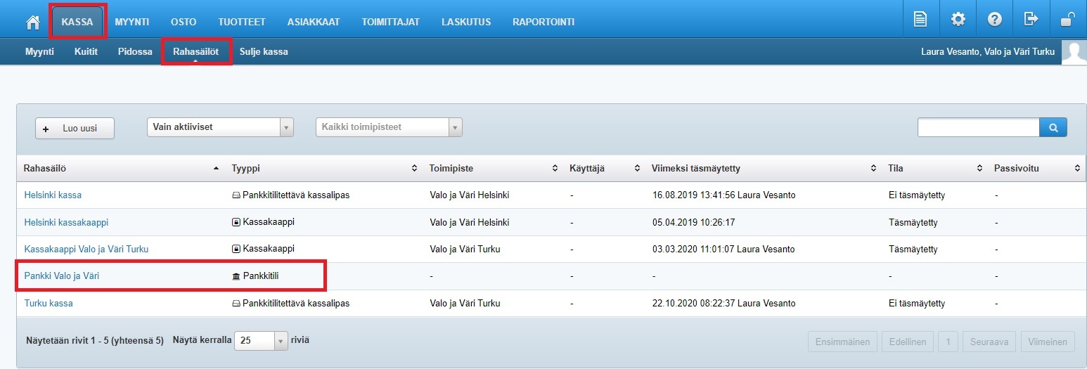- Siirry Kassa-ohjelman alta löytyvään Rahasäilöt-osioon ja valitse yrityksesi pankkitili: