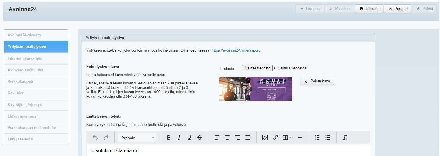 Avoinna24-sivuston esittelysivun sisältö luodaan ja sitä muokataan asetusten kohdassa Avoinna24 / Yrityksen esittelysivu.