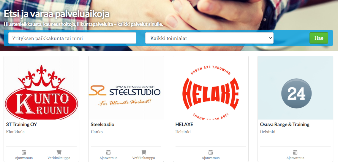 Jos yritystäsi ei löydy hausta, tarkista että ajanvarauksesi ja/tai verkkokauppasi on julkaistu. Tästä löytyy lisätietoa ohjeesta Avoinna24-verkkokaupan tai internetajanvarauksen julkaiseminen.