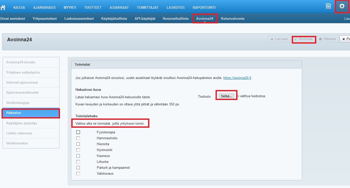 Avoinna24-palvelusta löytyy etusivulta toimialahaku, jotta asiakas löytää etsimänsä palvelun helposti. Jotta yrityksesi löytyy oikean toimialan alta, käy tarkistamassa asetuksesi, ja lisää toimialat, joilla yrityksesi toimii! Samalla Hakusivu-välilehdellä voit myös lisätä logon tai muun kuvan yrityksestä oletuskuvan sijaan, jolloin asiakkaat tunnistavat yrityksesi paremmin:
